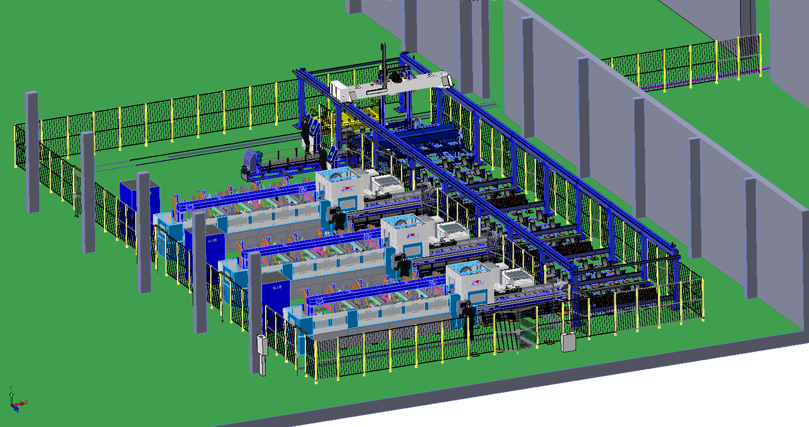 通過在庫房至激光加工車間之間建立一條自動傳輸線,實(shí)現(xiàn)成捆原材料及成品往返傳輸,實(shí)現(xiàn)了自動接收、智能分配、調(diào)度任務(wù),柔性加工生產(chǎn),高速高精、安全穩(wěn)定運(yùn)行、高質(zhì)量智能加工。該產(chǎn)線由中央調(diào)度系統(tǒng)自動分配任務(wù),三臺全自動激光切管機(jī)對指派的任務(wù)實(shí)現(xiàn)全自動上料、下料及激光加工;自動分揀系統(tǒng)對加工彈架進(jìn)行自動分揀、計(jì)數(shù),到達(dá)指定數(shù)量后,全自動搬運(yùn)系統(tǒng)進(jìn)行自動搬運(yùn)至內(nèi)壁處理系統(tǒng);內(nèi)壁自動處理系統(tǒng)對彈架進(jìn)行自動分料、上料、內(nèi)壁拋光、自動下料,完成拋光的彈架通過RGV傳輸線轉(zhuǎn)運(yùn)至焊接、裝配車間進(jìn)行焊接、裝配、打包,彈架成品經(jīng)RGV傳輸線返回庫房;生產(chǎn)線配以封閉安全防護(hù)系統(tǒng)及聲光報(bào)警系統(tǒng)。