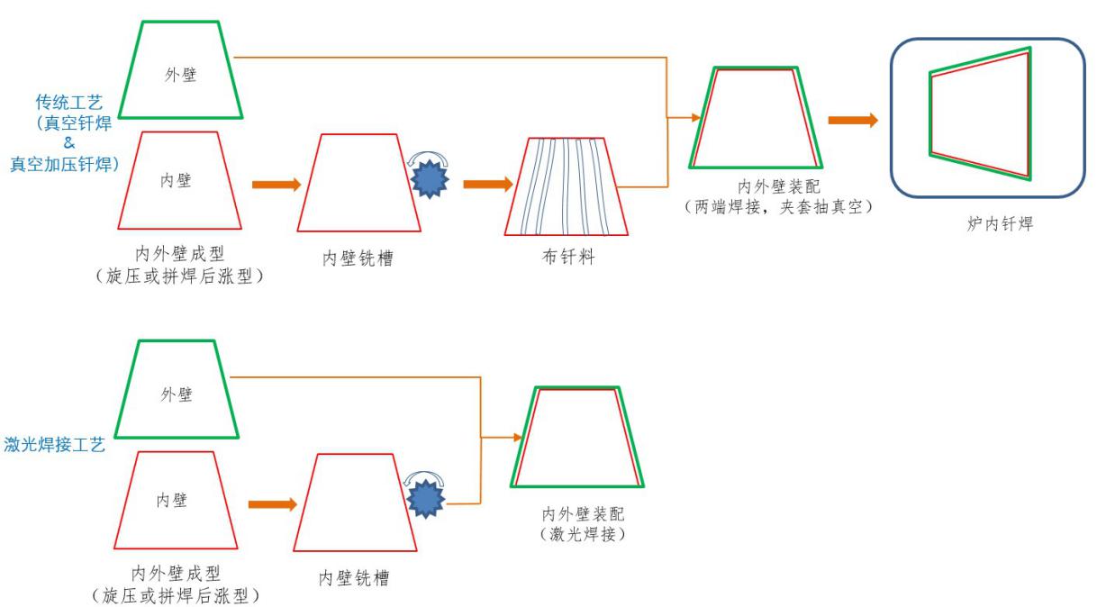 激光作為火箭發(fā)動機(jī)身部及噴管延伸段焊接方式有眾多優(yōu)勢。傳統(tǒng)的火箭發(fā)動機(jī)噴管延伸段分為:再生冷卻式、輻射冷卻式、排放冷卻式、燒蝕冷風(fēng)式。真空釬焊是銑槽式再生冷卻噴管夾層的常規(guī)焊接方法,此方式焊縫強(qiáng)度一般,操作流程復(fù)雜,焊接需在真空環(huán)境中進(jìn)行,焊接過程難以實現(xiàn)自動化,且對操作人員技術(shù)水平要求較高。國內(nèi)具有生產(chǎn)液體火箭發(fā)動機(jī)噴管能力的設(shè)備均為航天科技集團(tuán)旗下的7103廠、211廠所擁有,制造周期長,生產(chǎn)成本高。經(jīng)過分析與論證,激光焊接作為銑槽式再生冷卻噴管夾層結(jié)構(gòu)焊接的首選,具有制造周期短,自動化程度高,環(huán)境要求低等眾多優(yōu)勢,可大大縮短火箭發(fā)動機(jī)噴管研制周期(可壓縮至10h),降低噴管的制造成本,從而有效降低火箭的發(fā)射成本。