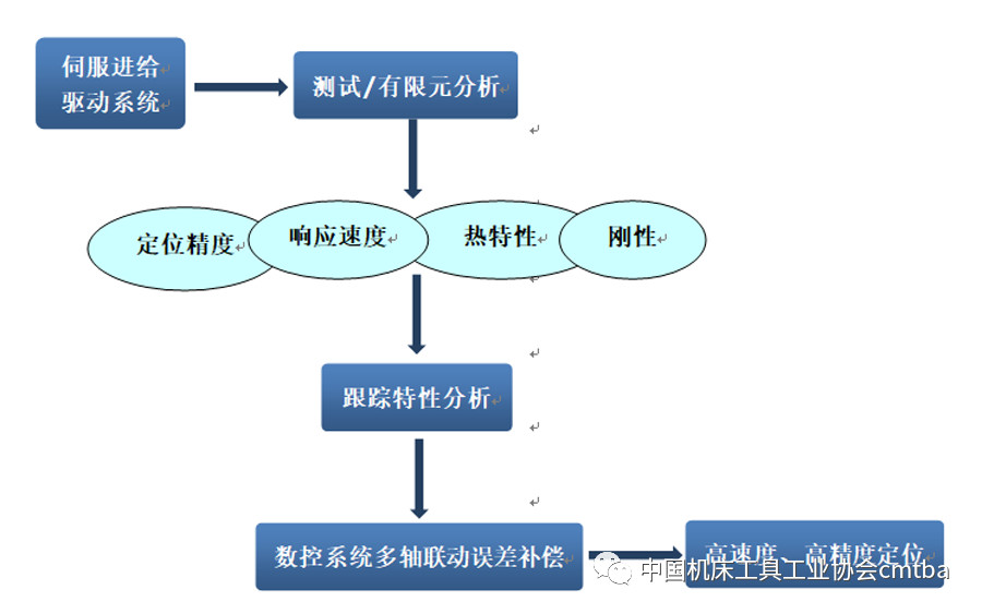 對(duì)電機(jī)及伺服進(jìn)給驅(qū)動(dòng)系統(tǒng)進(jìn)行測(cè)試及有限元分析,結(jié)合定位精度、響應(yīng)速度、熱特性、電機(jī)剛性進(jìn)行分析及優(yōu)化,并跟蹤特性分析,對(duì)數(shù)控系統(tǒng)多軸聯(lián)動(dòng)進(jìn)行誤差補(bǔ)償,獲得高速度,高精度定位。伺服驅(qū)動(dòng)系統(tǒng)分析方框圖如圖5所示。