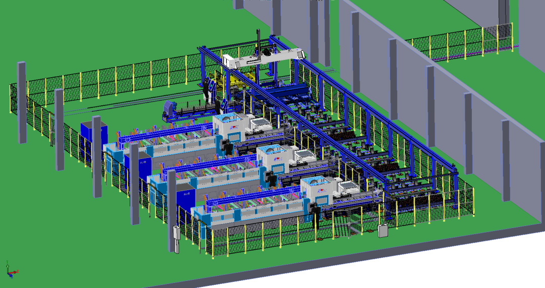 激光切管柔性生產(chǎn)線(切管FMS)將庫房至激光加工車間之間建立一條自動傳輸線,實現(xiàn)成捆原材料及成品往返傳輸。