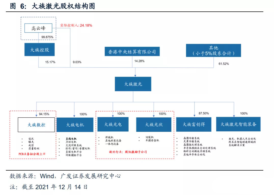 大族激光創(chuàng)始人高云峰先生是公司的實(shí)控人,擔(dān)任公司的董事長(zhǎng)。高云峰先生直接持股9.03%,通過大族控股間接持股15.17%,合計(jì)持股24.18%。