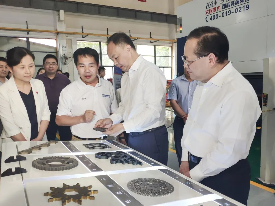 鄭建新代市長(zhǎng)一行來(lái)到湖南大族生產(chǎn)車(chē)間,觀看智能裝備集團(tuán)全國(guó)各地工廠生產(chǎn)實(shí)況,詳細(xì)了解大族激光技術(shù)創(chuàng)新、工藝特征、應(yīng)用前景與復(fù)工復(fù)產(chǎn)等情況。陳總詳細(xì)介紹了激光切割機(jī)、三維五軸激光加工裝備,及光纖激光器、功能部件、數(shù)控系統(tǒng)等核心部件的研制、銷(xiāo)售與市場(chǎng)應(yīng)用情況,并就疫情防控舉措、未來(lái)發(fā)展規(guī)劃等進(jìn)行一一匯報(bào)。