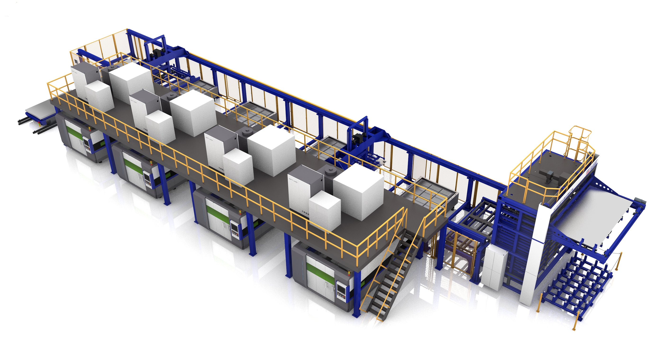 FMS激光切割柔性生產(chǎn)線主要由計(jì)算機(jī)CAD /CAM編程系統(tǒng)、10層立體倉(cāng)庫(kù)、物流系統(tǒng)、自動(dòng)上下料系統(tǒng)、多臺(tái)平面激光切割機(jī)系統(tǒng)、成品分揀臺(tái)系統(tǒng)組成,可以實(shí)現(xiàn)從上料到切割再到分揀成品的全過程無人化自動(dòng)操作,切實(shí)滿足了用戶高效率、高智能、高柔性、低成本的生產(chǎn)要求。