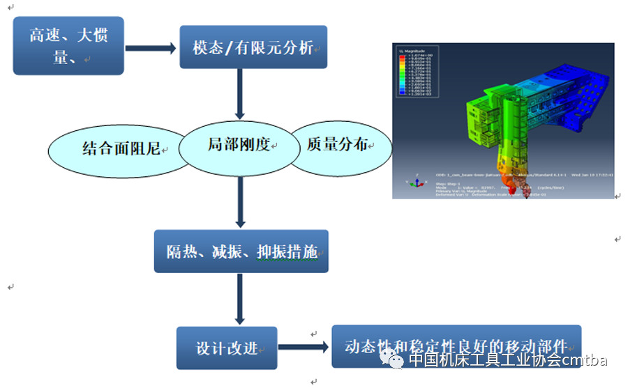 對(duì)高速度、大慣量、大尺寸的部件進(jìn)行CAE有限元模態(tài)分析,對(duì)結(jié)合面阻尼、局部剛度、質(zhì)量分布進(jìn)行分析,采取隔振、減振、抑振措施,對(duì)結(jié)構(gòu)進(jìn)行設(shè)計(jì)改進(jìn)及優(yōu)化,經(jīng)過(guò)反復(fù)測(cè)試驗(yàn)證,獲取動(dòng)態(tài)性能和穩(wěn)定性良好的移動(dòng)部件,確保產(chǎn)品的動(dòng)態(tài)性能與穩(wěn)定性。提高動(dòng)態(tài)性能和穩(wěn)定性方框圖與模態(tài)分析圖分別如圖3 、圖4所示。
