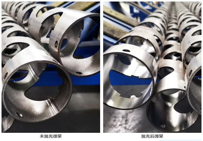 內(nèi)壁自動處理系統(tǒng)對彈架進行自動分料、上料、內(nèi)壁自動拋光、自動下料,拋光后內(nèi)壁潔凈。