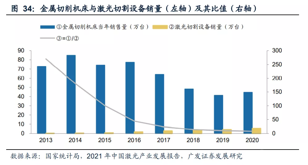 到2020年,金屬切削機(jī)床銷量降至44.60萬臺(tái),激光切割設(shè)備銷量升至5.50萬臺(tái)。金屬切削機(jī)床銷量對(duì)激光切割設(shè)備的比值從2013年的270迅速下滑至2020年的8。