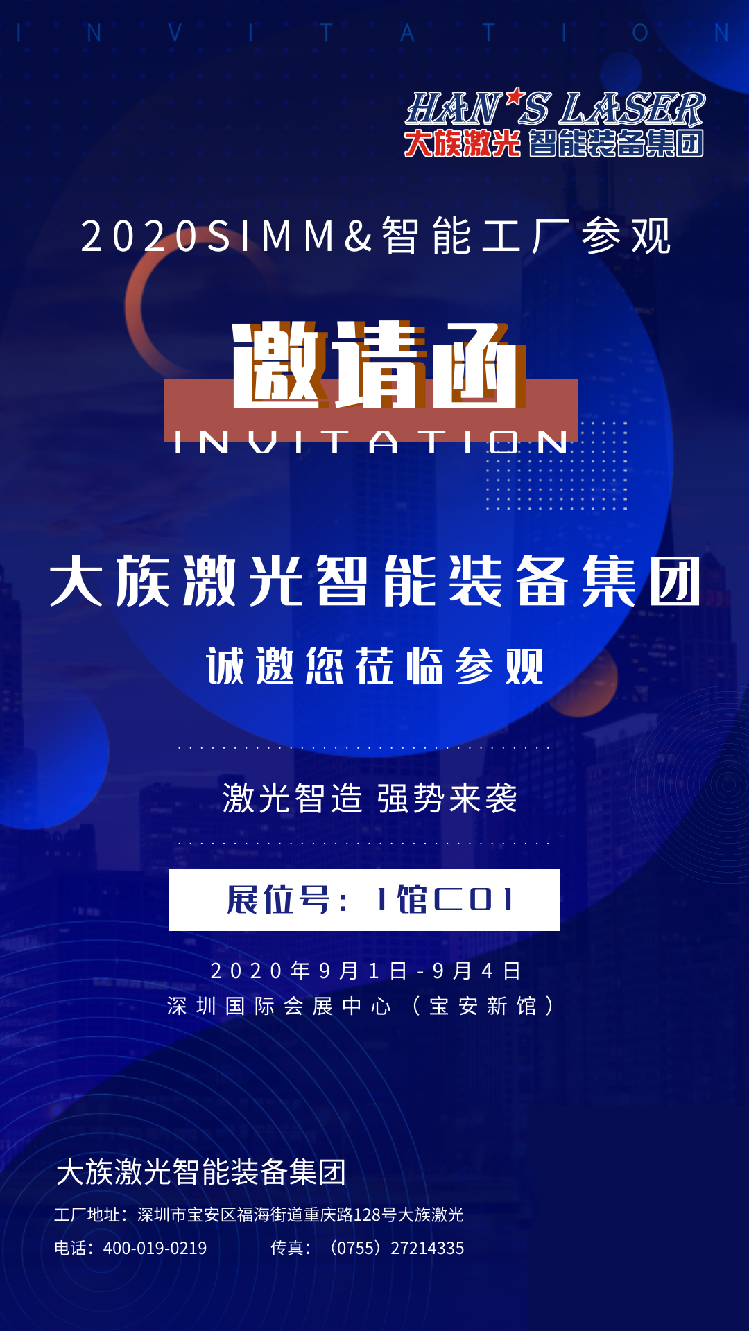400-666-4000金秋九月,秋風(fēng)颯爽。ITES深圳國(guó)際工業(yè)制造技術(shù)展覽會(huì)(第21屆SIMM深圳國(guó)際機(jī)械制造工業(yè)展覽會(huì)),將于2020年9月1-4日在深圳國(guó)際會(huì)展中心(寶安新館)舉行,大族激光智能裝備集團(tuán)攜激光智能制造系統(tǒng)解決方案亮相,展位號(hào)1館C01;同期,舉辦大族激光智能工廠開(kāi)放活動(dòng),期待您的蒞臨參觀!...